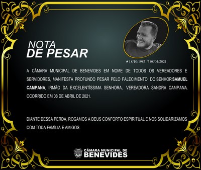 A CÂMARA MUNICIPAL DE BENEVIDES EM NOME DE TODOS OS VEREADORES E SERVIDORES, MANIFESTA PROFUNDO PESAR PELO FALECIMENTO DO SENHOR SAMUEL CAMPANA, IRMÃO DA EXCELENTÍSSIMA SENHORA, VEREADORA SANDRA CAMPANA, OCORRIDO EM 08 DE ABRIL DE 2021.